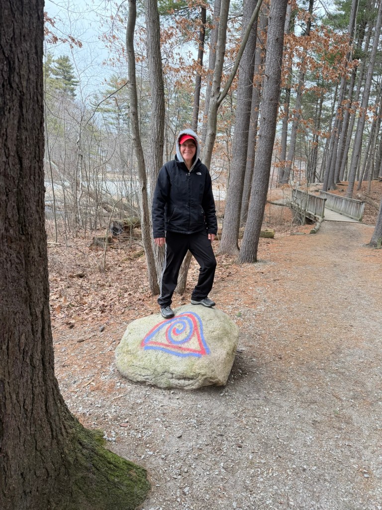 My fiancée posing on a rock painted with an eye on our hike today in Manchester, NH
